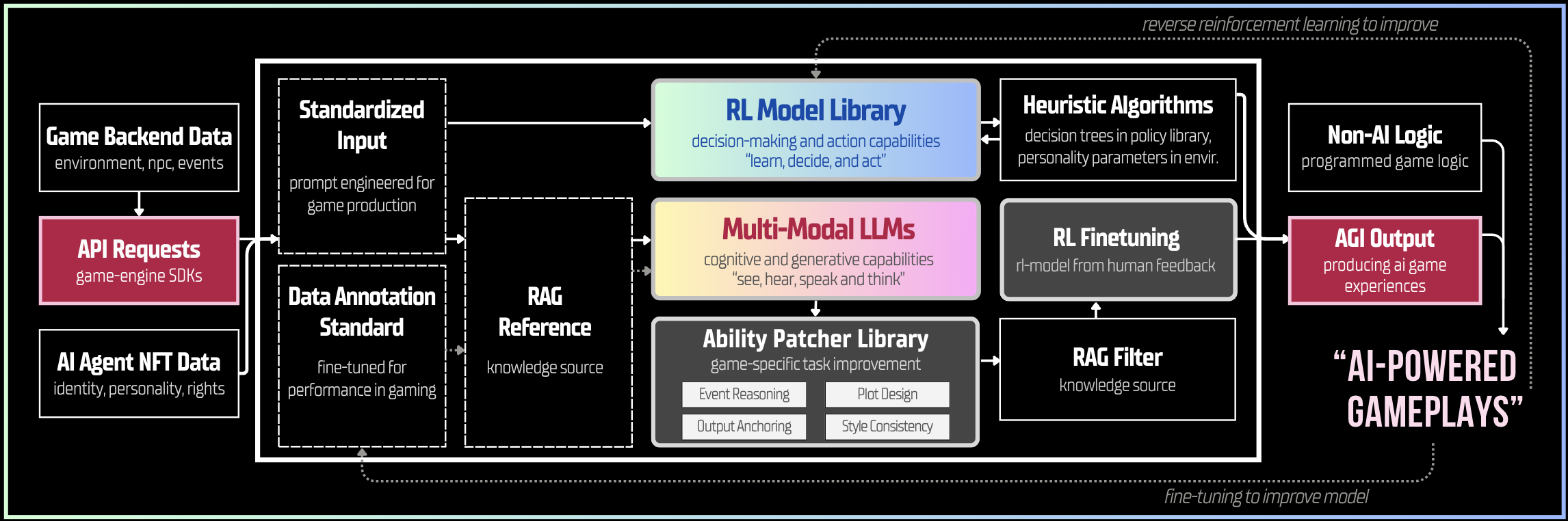 Our R&D focuses on developing modular, gaming-specific technologies that is irreplaceable amid the rapid development of AI technologies. The MLLM backbone, the field-specific knowledge base for RAG, the different designs of ability patchers, and many other components are all connected yet relatively isolated, which allows us to always position ourselves at the forefront of AI technologies.