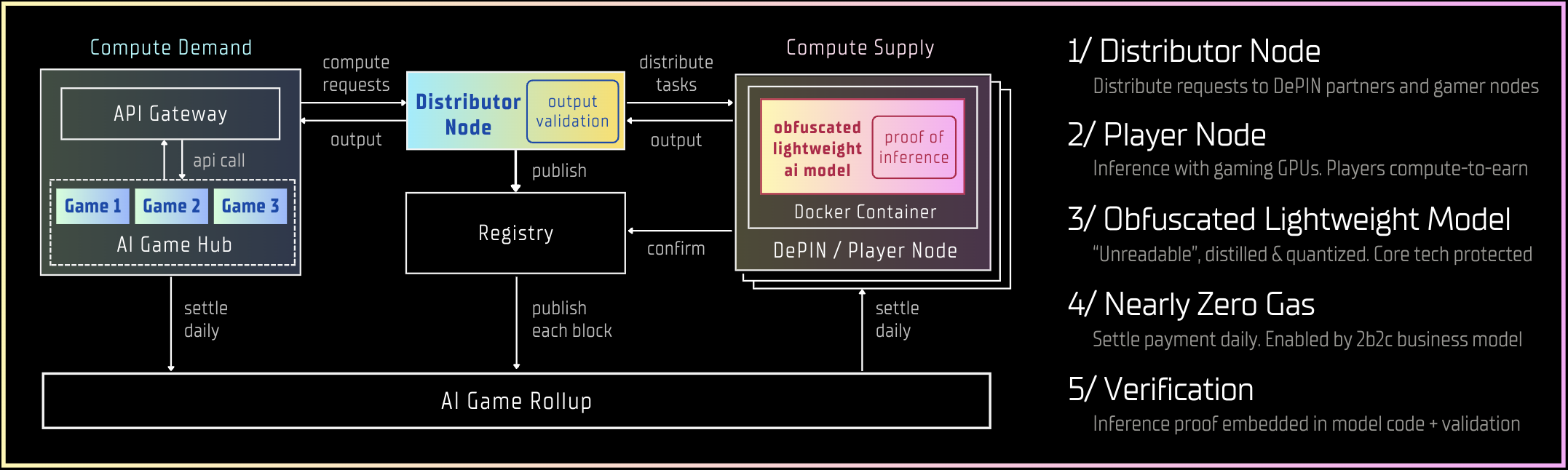 Distributor Node: The Distributor Node is crucial in managing AI inferencing requests within our Compute Network, serving as the intermediary between the AI Game Hub and compute suppliers. Its main tasks include encrypting and decrypting inferencing requests, distributing tasks based on Player Node performance, verifying the proof of inference, and conducting random output quality checks to ensure the reliability and accuracy of the outputs.